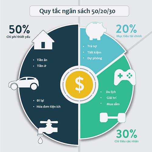 | 50% | Nhu cầu thiết yếu | Nhà ở, ăn uống, điện nước, xăng xe, học phí… |
